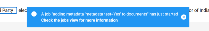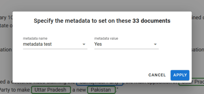 - In the window that opens you can select either existing metadata fields or define a new one (for instance “Metadata Test” as below) and then specify the value (for instance “Yes”) that you want to store with your document or documents.