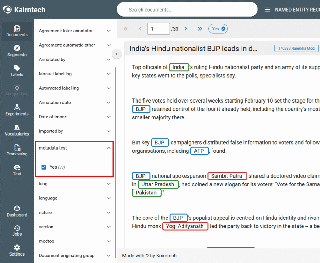 - Once the job is completed, you can filter this document or list of documents in the search interface as below.