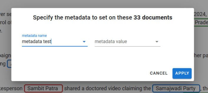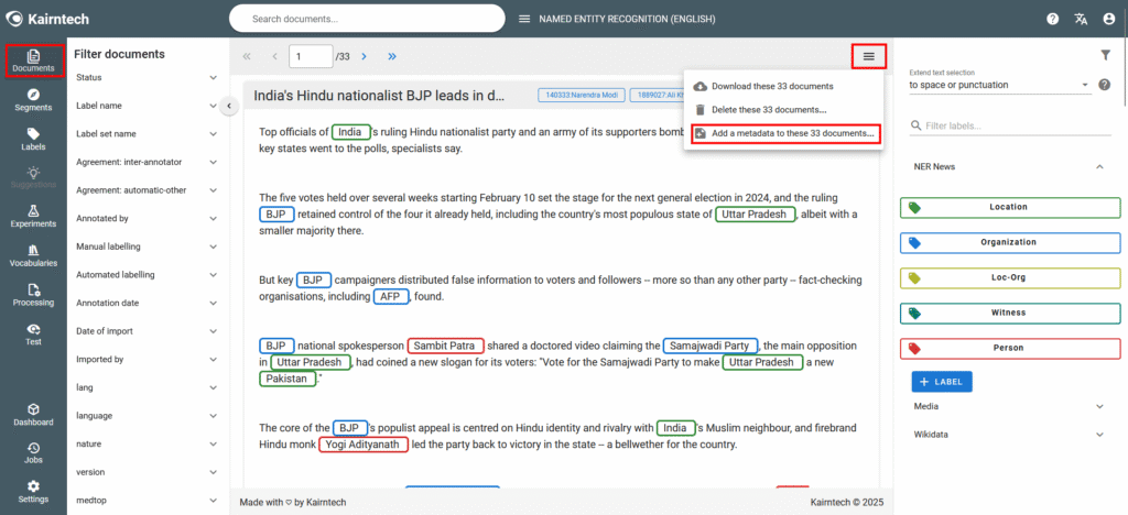 - Open the menu at the top right and click on Add a metadata to these XX documents.